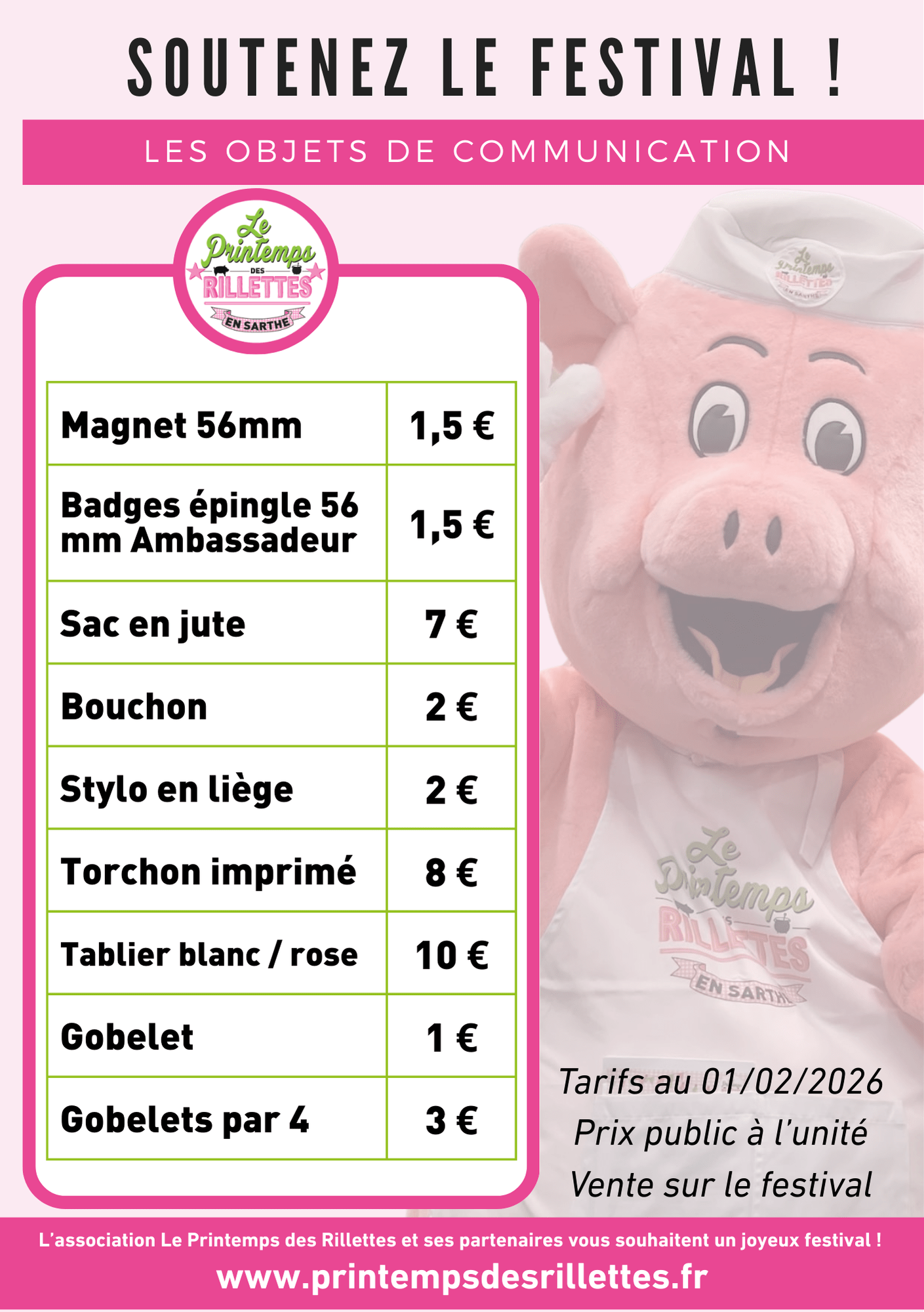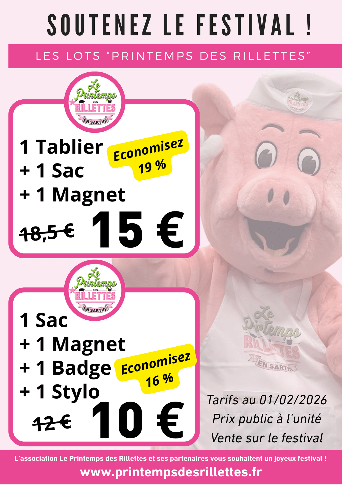 Les VENTES A L’UNITE sont réalisées par les bénévoles de l’association uniquement lors des événements officiels du Printemps des Rillettes (repérez notre stand), ou bien par les professionnels ou les organisateurs lors des événements locaux qu’ils réalisent.