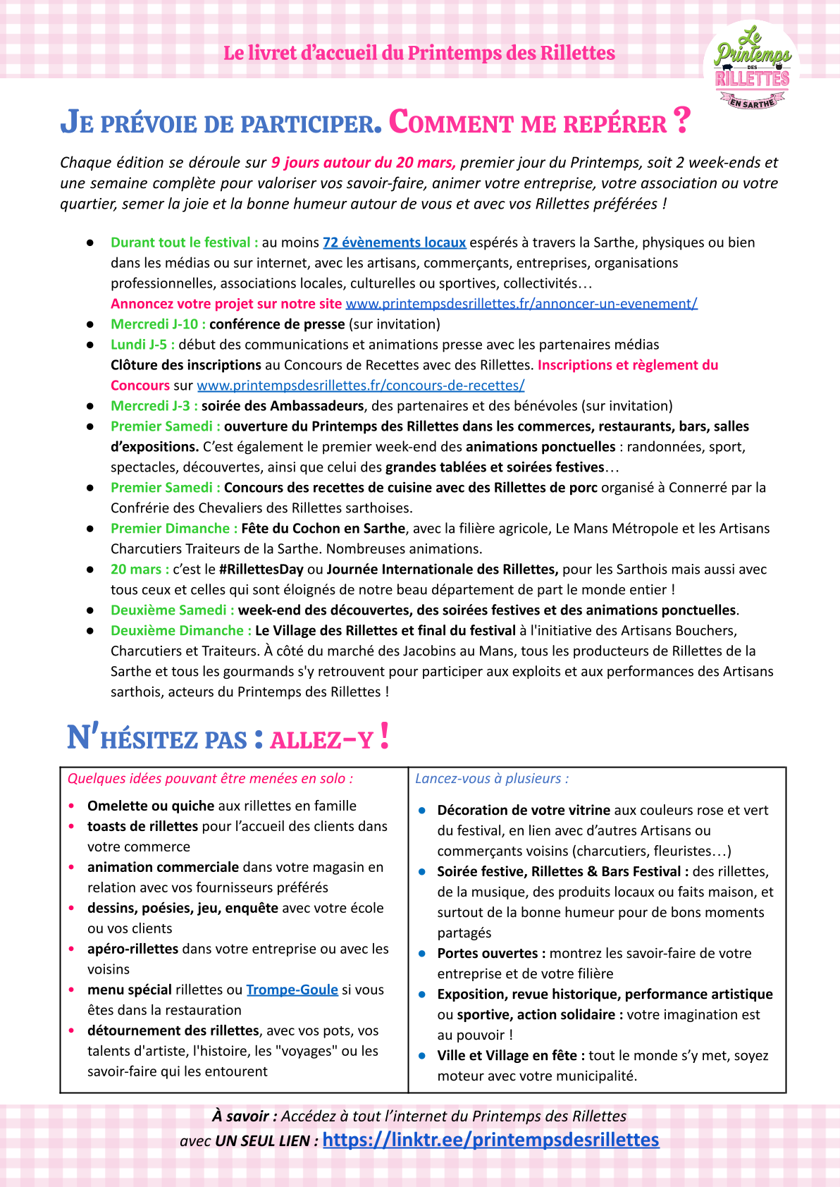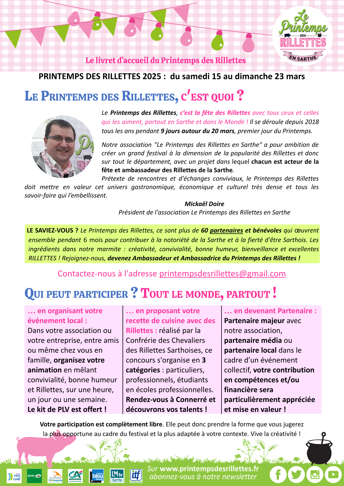 Devenez l’un des acteurs ou des bénévoles du Printemps des Rillettes 2025. On vous explique tout dans notre LIVRET D’ACCUEIL 2025 à télécharger :